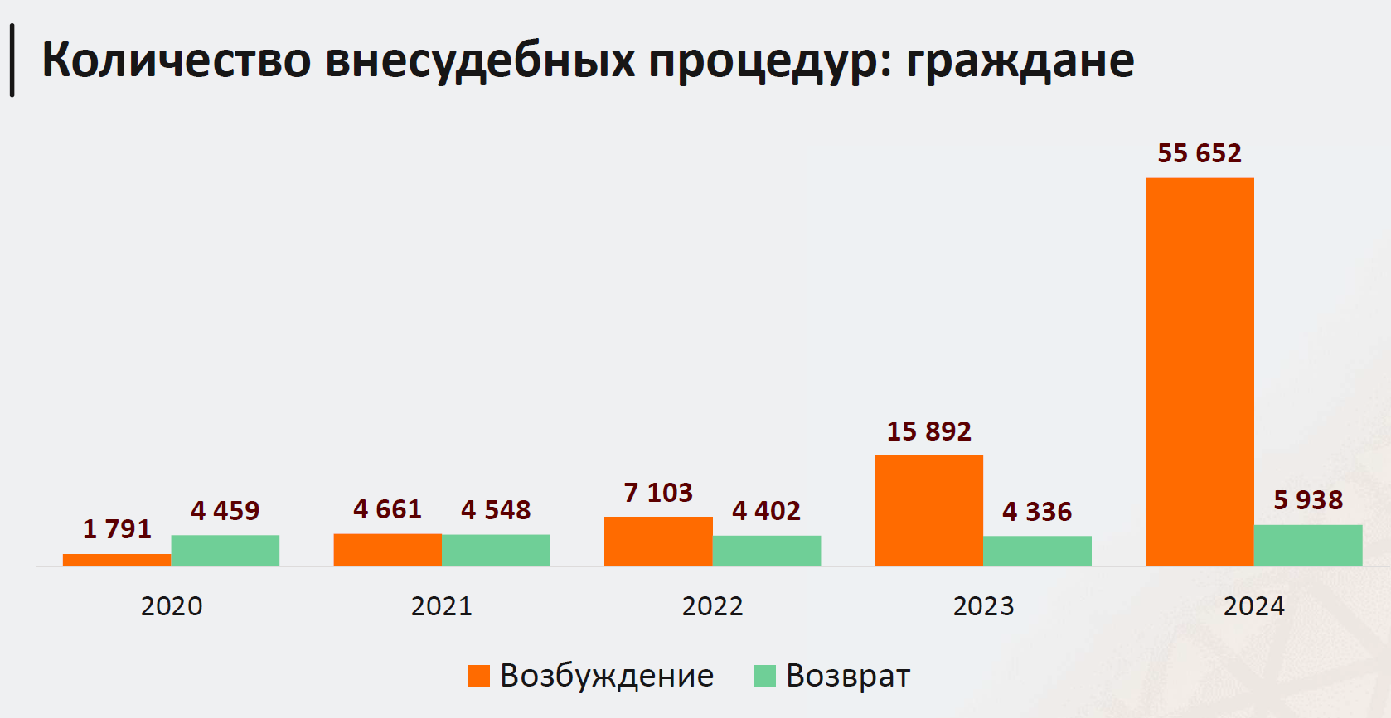 Впечатляющие результаты в прошедшем году показало внесудебное банкротство. Законодатели снизили планку требований к должникам, которым доступно списание долгов через МФЦ, и граждане быстро этим воспользовались. В 2024 году было возбуждено 55 652 процедур – в 3,5 раза (!) больше, чем годом ранее.